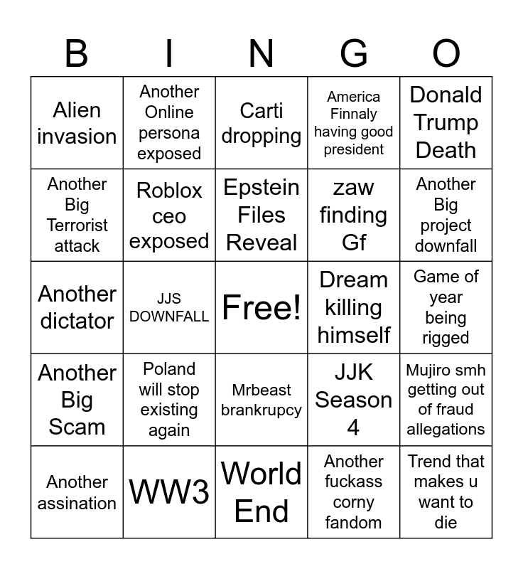 This bingo card has a free space and 24 words: Poland will stop existing again, WW3, Epstein Files Reveal, Another assination, Donald Trump Death, Alien invasion, Another Big Terrorist attack, Another Online persona exposed, Dream killing himself, Mrbeast brankrupcy, zaw finding Gf, Another dictator, JJK Season 4, Mujiro smh getting out of fraud allegations, Roblox ceo exposed, Another fuckass corny fandom, Game of year being rigged, Carti dropping, Another Big project downfall, JJS DOWNFALL, Trend that makes u want to die, Another Big Scam, America Finnaly having good president and World End.