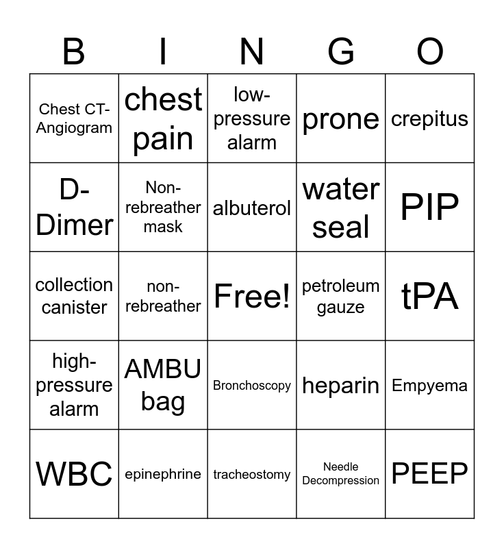 This bingo card has a free space and 26 words: Bronchoscopy, Needle Decompression, albuterol, epinephrine, crepitus, Chest CT-Angiogram, D-Dimer, chest pain, tPA, heparin, water seal, collection canister, Empyema, WBC, non-rebreather, skin breakdown, prone, high-pressure alarm, low-pressure alarm, PEEP, PIP, tracheostomy, petroleum gauze, AMBU bag, Non-rebreather mask and Reservoir.