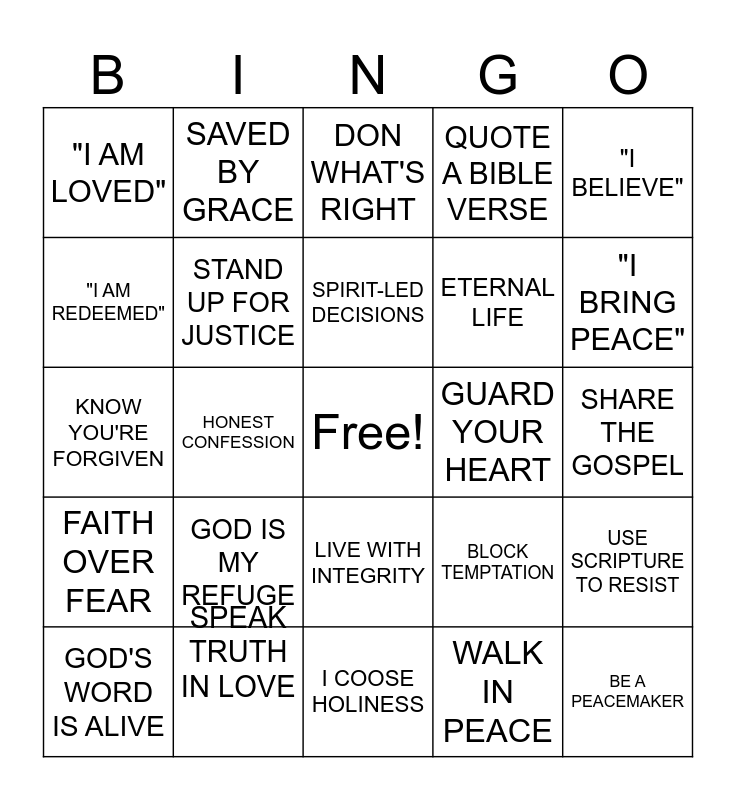 This bingo card has a free space and 30 words: SPEAK TRUTH IN LOVE, REJECT LIES, HONEST CONFESSION, TRUTH SETS YOU FREE, "I AM LOVED", DON WHAT'S RIGHT, STAND UP FOR JUSTICE, LIVE WITH INTEGRITY, GUARD YOUR HEART, I COOSE HOLINESS, SHARE THE GOSPEL, BE A PEACEMAKER, WALK IN PEACE, READY TO SERVE, "I BRING PEACE", TRUST GOD'S PROMISES, BLOCK TEMPTATION, FAITH OVER FEAR, GOD IS MY REFUGE, "I BELIEVE", KNOW YOU'RE FORGIVEN, RENEW YOUR MIND, SAVED BY GRACE, ETERNAL LIFE, "I AM REDEEMED", QUOTE A BIBLE VERSE, USE SCRIPTURE TO RESIST, GOD'S WORD IS ALIVE, SPIRIT-LED DECISIONS and "IT IS WRITTEN".