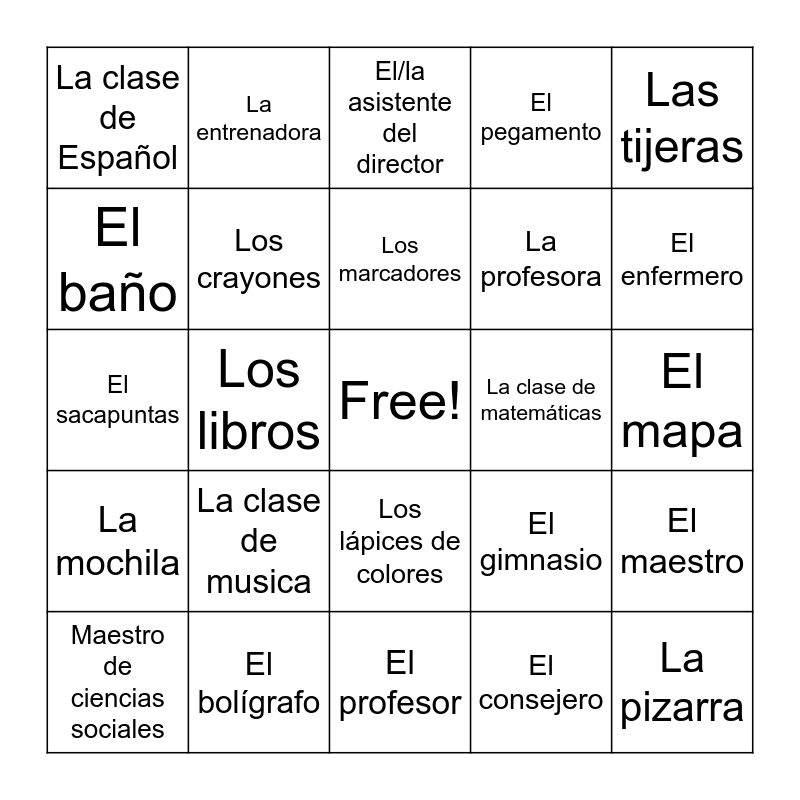 This bingo card has a free space and 41 words: El lápiz, El sacapuntas, El borrador, Los crayones, El bolígrafo, Los lápices de colores, Los marcadores, La regla, Las tijeras, La mochila, Los libros, El pegamento, La pizarra, El mapa, La clase de matemáticas, La clase de musica, La clase de ciencias sociales, La clase de Español, El director / La directora, El/la asistente del director, El maestro, La maestra, El profesor, La profesora, El secretario, La secretaria, El consejero, La consejera, El enfermero, La enfermera, El entrenador, La entrenadora, Maestro de ciencias sociales, El/la superintendente, El gimnasio, El baño, El patio, El laboratorio, La cafeteria, La biblioteca and La oficina.