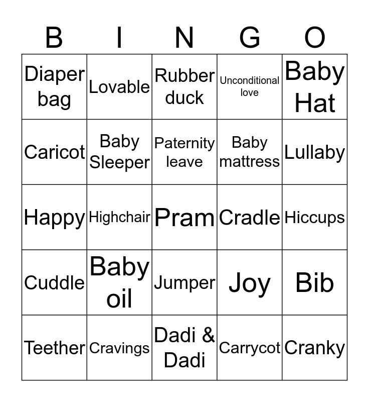This bingo card has 83 words: Free!, Toys, Rubber duck, Rattle, Tricycle, Playmat, Baby swing, Walker, Nursery Rhymes, Play gym, Stroller, Bottle, Baby Sleeper, Cradle, Pacifier, Diaper bag, Teether, Caricot, Baby Powder, Crib, Baby Cot, Baby mattress, Pram, Baby carseat, Highchair, Baby Carrier, Bubble Bath, Baby Tub, Daycare, Nap-time, Baby oil, Mom, Dad, Happy, Cranky, Sleepless nights, Dadi & Dadi, Baby photo album, Lullaby, Cuddle, Prince, Princess, Adorable, Cute, Baby giggles, Family, Lovable, Cooing, Nana & Nani, Laughter, Joy, Unconditional love, Hiccups, Due date, Story time, First birthday, Newborn, First birthday, Cravings, Baby bump, Granddaughter, Grandson, Moodswings, Baby Hat, Hooded towel, Bib, Wash clothes, Blanket, Onesies, Booties, Baby socks, Burp cloth, Mittens, Jumper, Carrycot, Baby Food, Milk, Paternity leave, Maternity leave, First cry, First hug, Pediatrician and Vaccination.