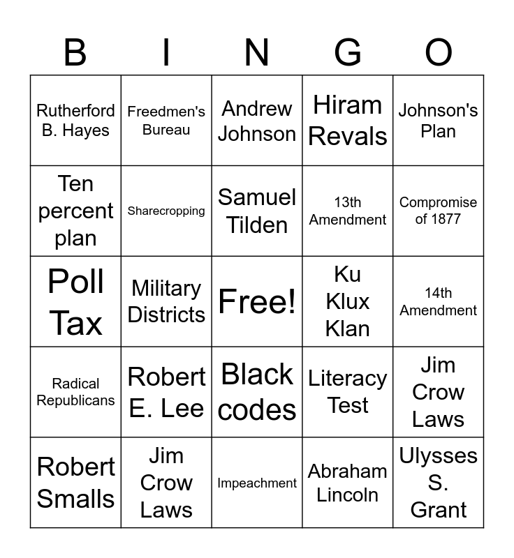 Reconstruction Bingo | Reconstruction and Industrial Revolution | Reconstruction and Industrial Revolution | Reconstruction Era | Reconstruction