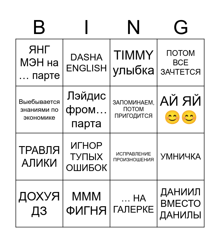 This bingo card has 16 words: МММ ФИГНЯ, УМНИЧКА, TIMMY улыбка, ЯНГ МЭН на … парте, ТРАВЛЯ АЛИКИ, DASHA ENGLISH, ИСПРАВЛЕНИЕ ПРОИЗНОШЕНИЯ, … НА ГАЛЕРКЕ, Выебывается знаниями по экономике, Лэйдис фром… парта, ДОХУЯ ДЗ, ПОТОМ ВСЕ ЗАЧТЕТСЯ, ИГНОР ТУПЫХ ОШИБОК, АЙ ЯЙ 😊😊, ЗАПОМИНАЕМ, ПОТОМ ПРИГОДИТСЯ and ДАНИИЛ ВМЕСТО ДАНИЛЫ.