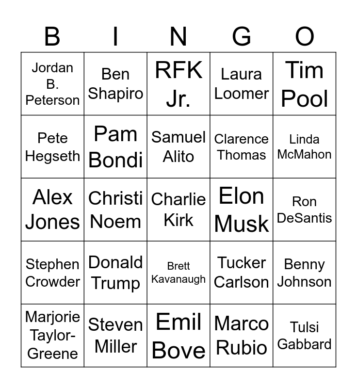 This bingo card has a free space and 24 words: Donald Trump, Steven Miller, Samuel Alito, Marjorie Taylor-Greene, Tim Pool, Jordan B. Peterson, Pete Hegseth, Ben Shapiro, Elon Musk, Brett Kavanaugh, Clarence Thomas, Alex Jones, Tucker Carlson, Benny Johnson, Pam Bondi, Marco Rubio, Ron DeSantis, RFK Jr., Linda McMahon, Christi Noem, Tulsi Gabbard, Stephen Crowder, Laura Loomer and Emil Bove.