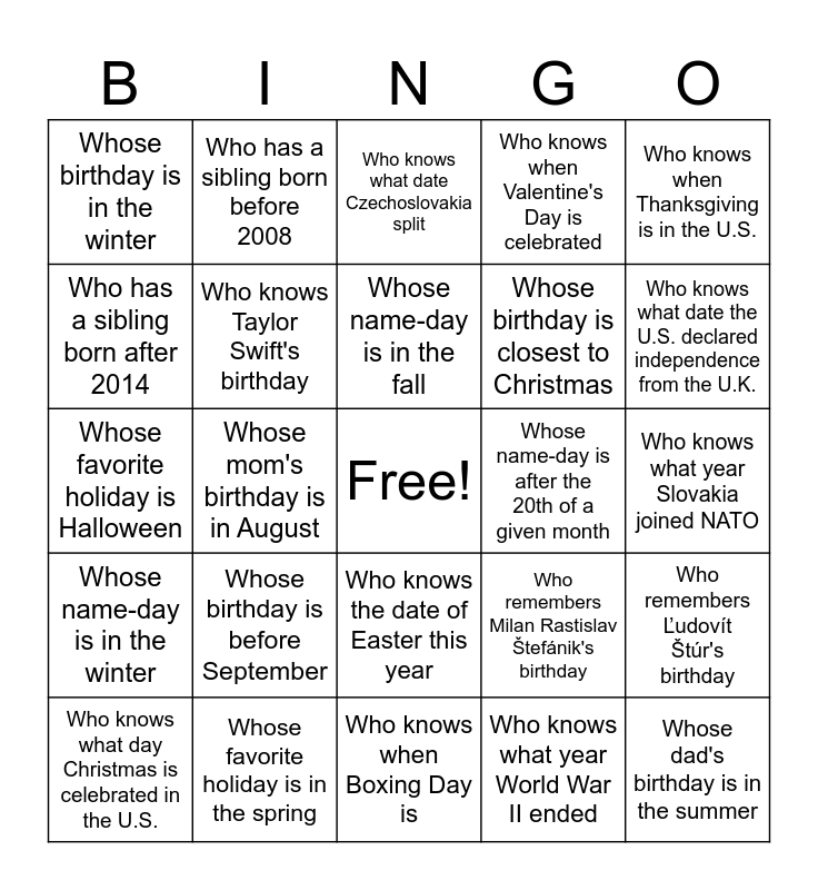 This bingo card has a free space and 24 words: Whose birthday is before September, Whose favorite holiday is in the spring, Whose name-day is in the fall, Who knows what day Christmas is celebrated in the U.S., Who knows when Thanksgiving is in the U.S., Whose birthday is in the winter, Who has a sibling born after 2014, Who has a sibling born before 2008, Whose name-day is after the 20th of a given month, Who knows the date of Easter this year, Whose birthday is closest to Christmas, Whose favorite holiday is Halloween, Who remembers Milan Rastislav Štefánik's birthday, Who remembers Ľudovít Štúr's birthday, Who knows Taylor Swift's birthday, Who knows what year World War II ended, Who knows what year Slovakia joined NATO, Who knows what date Czechoslovakia split, Who knows what date the U.S. declared independence from the U.K., Whose mom's birthday is in August, Whose dad's birthday is in the summer, Whose name-day is in the winter, Who knows when Valentine's Day is celebrated and Who knows when Boxing Day is.