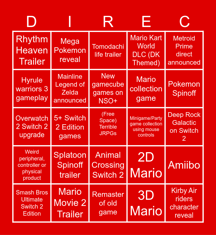 This bingo card has a free space and 24 words: Splatoon Spinoff trailer, Mario Movie 2 Trailer, New gamecube games on NSO+, Smash Bros Ultimate Switch 2 Edition, Metroid Prime direct announced, Rhythm Heaven Trailer, Hyrule warriors 3 gameplay, Mega Pokemon reveal, Minigame/Party game collection using mouse controls, Animal Crossing Switch 2, Mario collection game, Overwatch 2 Switch 2 upgrade, 2D Mario, Amiibo, Mainline Legend of Zelda announced, 3D Mario, Deep Rock Galactic on Switch 2, Tomodachi life trailer, Pokemon Spinoff, 5+ Switch 2 Edition games, Kirby Air riders character reveal, Weird peripheral, controller or physical product, Mario Kart World DLC (DK Themed) and Remaster of old game.