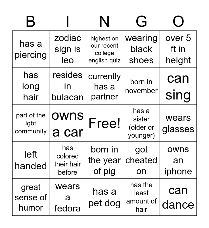 This bingo card has a free space and 24 words: has colored their hair before, wears a fedora, currently has a partner, great sense of humor, over 5 ft in height, has a piercing, has long hair, zodiac sign is leo, has a sister (older or younger), born in the year of pig, born in november, part of the lgbt community, got cheated on, owns an iphone, resides in bulacan, has the least amount of hair, wears glasses, highest on our recent college english quiz, can sing, owns a car, can dance, left handed, wearing black shoes and has a pet dog.