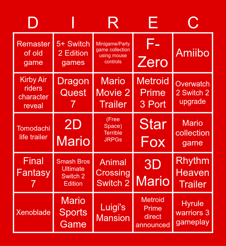 This bingo card has a free space and 42 words: Splatoon Spinoff trailer, Mario Movie 2 Trailer, New gamecube games on NSO+, Smash Bros Ultimate Switch 2 Edition, Metroid Prime direct announced, Rhythm Heaven Trailer, Hyrule warriors 3 gameplay, Mega Pokemon reveal, Minigame/Party game collection using mouse controls, Animal Crossing Switch 2, Mario collection game, Overwatch 2 Switch 2 upgrade, 2D Mario, Amiibo, Mainline Legend of Zelda announced, 3D Mario, Deep Rock Galactic on Switch 2, Tomodachi life trailer, New Pokemon Spinoff announced, 5+ Switch 2 Edition games, Kirby Air riders character reveal, Weird peripheral, controller or physical product, Mario Kart World DLC (DK Themed), Remaster of old game, Diddy Kong Racing, Helldivers 2 Switch 2, Metroid Prime 3 Port, New IP, Playtest MMO, New Legends ZA footage, Pokemon Champions, Final Fantasy 7, Dragon Quest 7, Luigi's Mansion, Mario Galaxy 2, Xenoblade, Mario Sports Game, Star Fox, Pikmin, Ring Fit Adventure / Fitness game, F-Zero and Kid Icarus.