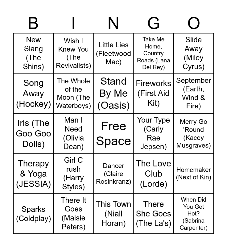 This bingo card has a free space and 29 words: Sparks (Coldplay), under the mat (sombr), Man I Need (Olivia Dean), Kiss Me (Sixpence None the Richer), New Slang (The Shins), Little Lies (Fleetwood Mac), The Whole of the Moon (The Waterboys), Girl Crush (Harry Styles), Your Type (Carly Rae Jepsen), There It Goes (Maisie Peters), Merry Go 'Round (Kacey Musgraves), When Did You Get Hot? (Sabrina Carpenter), This Town (Niall Horan), There She Goes (The La's), September (Earth, Wind & Fire), Diet Pepsi (Addison Rae), Dancer (Claire Rosinkranz), Therapy & Yoga (JESSIA), Slide Away (Miley Cyrus), Iris (The Goo Goo Dolls), The Love Club (Lorde), willow (Taylor Swift), Fireworks (First Aid Kit), Song Away (Hockey), Take Me Home, Country Roads (Lana Del Rey), Wish I Knew You (The Revivalists), Homemaker (Next of Kin), Stand By Me (Oasis) and Linger (The Cranberries).
