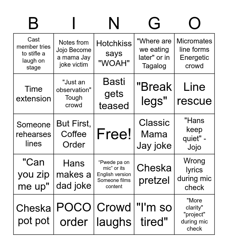 This bingo card has a free space and 31 words: Crowd laughs, *PIG SNORT* laugh, But First, Coffee Order, Starbucks Order, Cast member tries to stifle a laugh on stage, Hotchkiss says "WOAH", "Just an observation" Tough crowd, Cheska pretzel, Classic Mama Jay joke, "I'm so tired", "Hans keep quiet" - Jojo, "More clarity" "project" during mic check, Kuya Tpen adlibs new line, Katie goes into the men’s dressing room for no reason, Line rescue, Ayam is first to mic check, Wrong lyrics during mic check, Hans makes a dad joke, "Can you zip me up", “Pwede pa on mic” or its English version Someone films content, Micromates line forms Energetic crowd, Someone brings packed lunch, Cheska pot pot, Notes from Jojo Become a mama Jay joke victim, "Break legs", Time extension, "Where are we eating later" or in Tagalog, Someone rehearses lines, POCO order, Basti gets teased and Paul makes a pop culture reference.