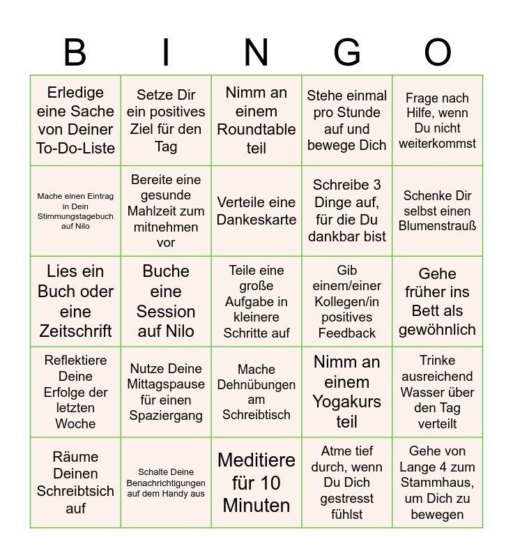 This bingo card has 25 words: Nutze Deine Mittagspause für einen Spaziergang, Meditiere für 10 Minuten, Verteile eine Dankeskarte, Räume Deinen Schreibtsich auf, Frage nach Hilfe, wenn Du nicht weiterkommst, Erledige eine Sache von Deiner To-Do-Liste, Mache einen Eintrag in Dein Stimmungstagebuch auf Nilo, Setze Dir ein positives Ziel für den Tag, Gib einem/einer Kollegen/in positives Feedback, Mache Dehnübungen am Schreibtisch, Schreibe 3 Dinge auf, für die Du dankbar bist, Lies ein Buch oder eine Zeitschrift, Nimm an einem Yogakurs teil, Trinke ausreichend Wasser über den Tag verteilt, Bereite eine gesunde Mahlzeit zum mitnehmen vor, Gehe von Lange 4 zum Stammhaus, um Dich zu bewegen, Gehe früher ins Bett als gewöhnlich, Nimm an einem Roundtable teil, Schenke Dir selbst einen Blumenstrauß, Buche eine Session auf Nilo, Teile eine große Aufgabe in kleinere Schritte auf, Schalte Deine Benachrichtigungen auf dem Handy aus, Reflektiere Deine Erfolge der letzten Woche, Stehe einmal pro Stunde auf und bewege Dich and Atme tief durch, wenn Du Dich gestresst fühlst.