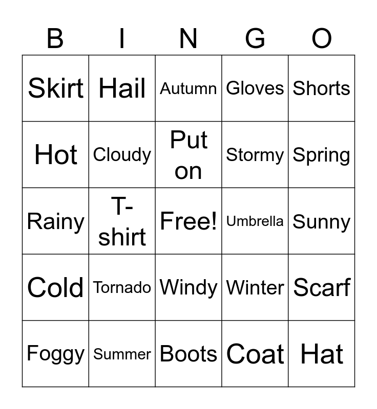 This bingo card has a free space and 29 words: Foggy, Rainbow, T-shirt, Cap, Skirt, Autumn, Cloudy, Tornado, Umbrella, Summer, Sunny, Hat, Boots, Coat, Spring, Snowy, Windy, Cold, Shorts, Rainy, Winter, Lightning, Stormy, Hot, Gloves, Hail, Scarf, Put on and Raincoat.