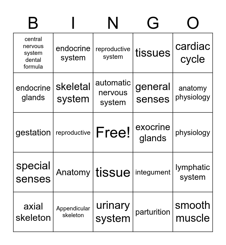 This bingo card has a free space and 24 words: Anatomy, Appendicular skeleton, automatic nervous system, axial skeleton, cardiac cycle, central nervous system dental formula, endocrine glands, endocrine system, exocrine glands, tissue, general senses, gestation, integument, lymphatic system, skeletal system, parturition, physiology, reproductive system, anatomy physiology, reproductive, smooth muscle, special senses, tissues and urinary system.