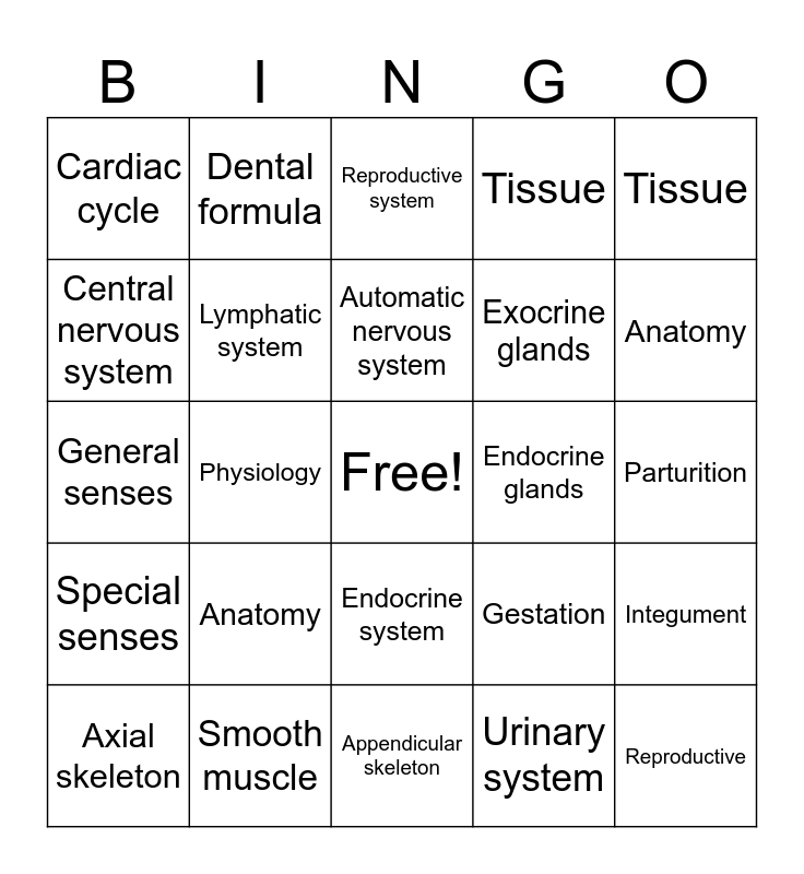 This bingo card has a free space and 25 words: Anatomy, Appendicular skeleton, Automatic nervous system, Axial skeleton, Tissue, Cardiac cycle, Central nervous system, Dental formula, Endocrine glands, Endocrine system, Exocrine glands, General senses, Gestation, Integument, Lymphatic system, Skeletal system, Parturition, Reproductive system, Anatomy, Physiology, Reproductive, Smooth muscle, Special senses, Tissue and Urinary system.