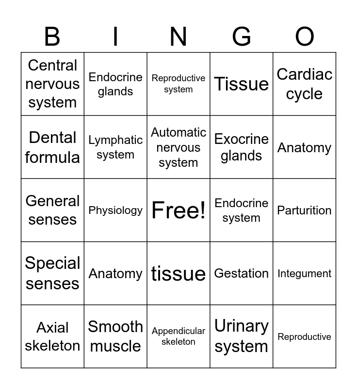 This bingo card has a free space and 25 words: Anatomy, Appendicular skeleton, Automatic nervous system, Axial skeleton, Cardiac cycle, Central nervous system, Dental formula, Endocrine glands, Endocrine system, tissue, Exocrine glands, General senses, Gestation, Integument, Lymphatic system, Skeletal system, Parturition, Reproductive system, Anatomy, Physiology, Reproductive, Smooth muscle, Special senses, Tissue and Urinary system.