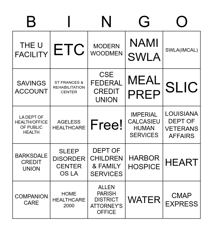 This bingo card has a free space and 28 words: HEART, EXCERCISE, MEAL PREP, WATER, SAVINGS ACCOUNT, MODERN WOODMEN, ETC, BARKSDALE CREDIT UNION, IMPERIAL CALCASIEU HUMAN SERVICES, COMPANION CARE, LA DEPT OF HEALTH/OFFICE OF PUBLIC HEALTH, NAMI SWLA, HOME HEALTHCARE 2000, ALLEN PARISH DISTRICT ATTORNEY'S OFFICE, SLIC, CENLA AREA AGENCY ON AGING, SLEEP DISORDER CENTER OS LA, ST FRANCES & REHABILITATION CENTER, CSE FEDERAL CREDIT UNION, DEPT OF CHILDREN & FAMILY SERVICES, THE U FACILITY, CALCASIEU COUNCIL, CMAP EXPRESS, AGELESS HEALTHCARE, LOUISIANA DEPT OF VETERANS AFFAIRS, HARBOR HOSPICE, SWLA(IMCAL) and SWLA CENTER FOR HEALTH SERVICES.