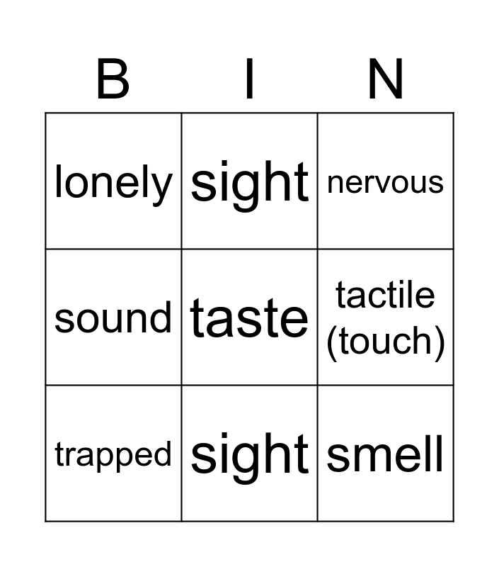 This bingo card has a free space and 8 words: tactile (touch), nervous, sight, trapped, lonely, smell, sound and sight.