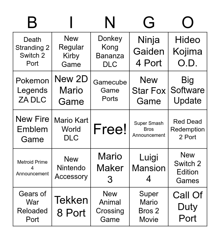 This bingo card has a free space and 24 words: New Nintendo Accessory, Tekken 8 Port, Gamecube Game Ports, Gears of War Reloaded Port, Hideo Kojima O.D., Death Stranding 2 Switch 2 Port, Pokemon Legends ZA DLC, New Regular Kirby Game, Super Smash Bros Announcement, Mario Maker 3, New Star Fox Game, New Fire Emblem Game, Luigi Mansion 4, New Switch 2 Edition Games, New 2D Mario Game, Super Mario Bros 2 Movie, Red Dead Redemption 2 Port, Donkey Kong Bananza DLC, Big Software Update, Mario Kart World DLC, Call Of Duty Port, Metroid Prime 4 Announcement, Ninja Gaiden 4 Port and New Animal Crossing Game.