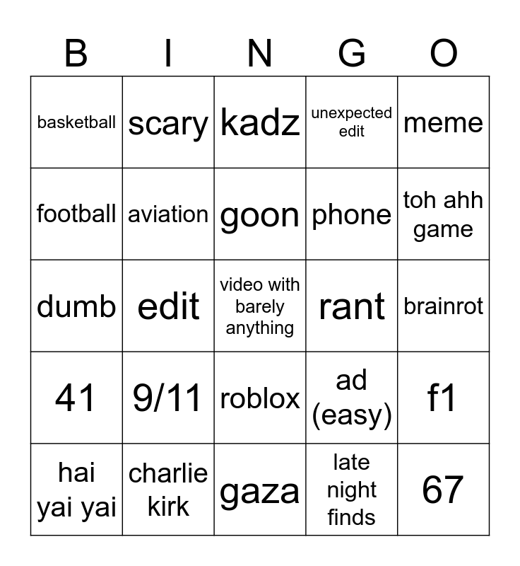 This bingo card has a free space and 24 words: 9/11, charlie kirk, goon, hai yai yai, meme, basketball, football, scary, rant, roblox, phone, dumb, ad (easy), f1, aviation, late night finds, brainrot, kadz, toh ahh game, edit, 67, 41, unexpected edit and gaza.