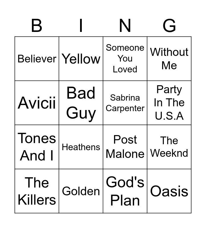This bingo card has 16 words: Golden, The Weeknd, Someone You Loved, Believer, Tones And I, Yellow, Post Malone, God's Plan, Avicii, Bad Guy, The Killers, Without Me, Heathens, Party In The U.S.A, Sabrina Carpenter and Oasis.