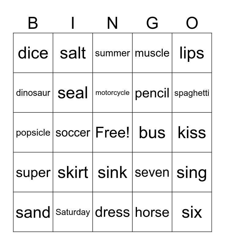 This bingo card has a free space and 35 words: sun, soda, sock, seal, sink, muscle, dinosaur, castle, motorcycle, bracelet, popsicle, lips, mouse, moose, dice, bus, horse, soccer, super, six, seven, sand, sing, Saturday, summer, spaghetti, see, glasses, pencil, kiss, purse, dress, skirt, salt and spin.