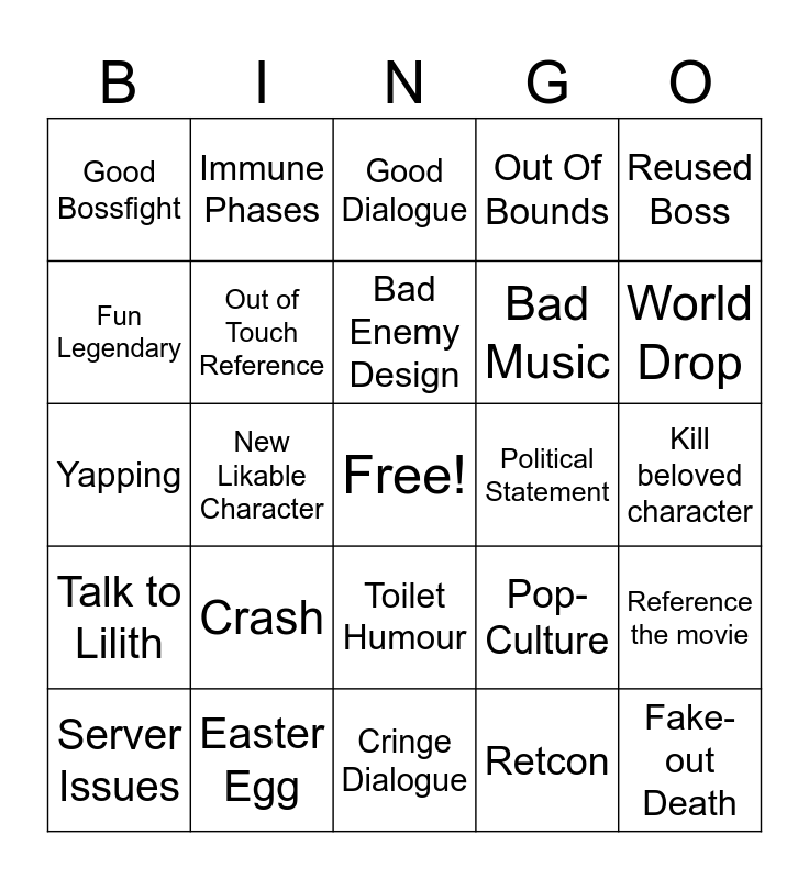 This bingo card has a free space and 31 words: Cringe Dialogue, Ava, New Likable Character, Soft Lock, Good Bossfight, Good Dialogue, Out of Touch Reference, Pop-Culture, Political Statement, Retcon, Kill beloved character, Fake-out Death, Driving Mission, Fake-out Ending, World Drop, "We Respect Player's Time", Reference the movie, Crash, Talk to Lilith, Toilet Humour, Reused Boss, Bad Optimization, Server Issues, Immune Phases, Bad Music, Fun Legendary, Out Of Bounds, Yapping, Easter Egg, Bad Enemy Design and Re-skinned Enemies.