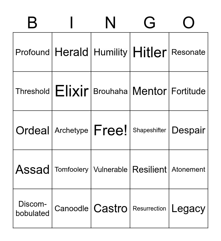 This bingo card has a free space and 24 words: Tomfoolery, Canoodle, Brouhaha, Discom-bobulated, Resonate, Profound, Threshold, Herald, Shapeshifter, Vulnerable, Mentor, Ordeal, Resilient, Atonement, Elixir, Resurrection, Despair, Humility, Fortitude, Archetype, Legacy, Assad, Hitler and Castro.