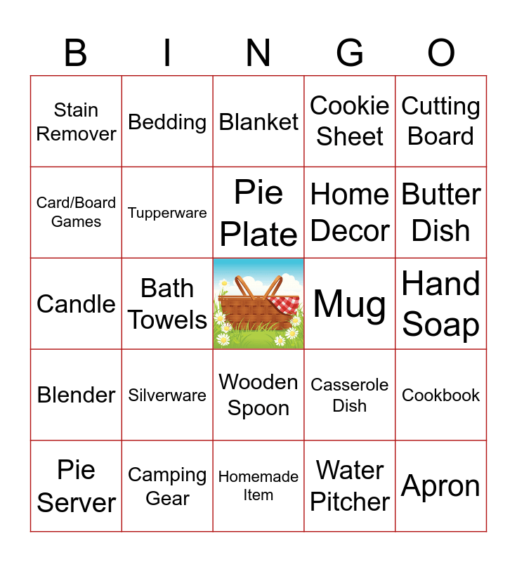 This bingo card has a free space and 24 words: Silverware, Camping Gear, Pie Plate, Pie Server, Cutting Board, Stain Remover, Card/Board Games, Bedding, Mug, Wooden Spoon, Home Decor, Candle, Casserole Dish, Cookbook, Tupperware, Water Pitcher, Hand Soap, Blanket, Butter Dish, Bath Towels, Apron, Blender, Cookie Sheet and Homemade Item.