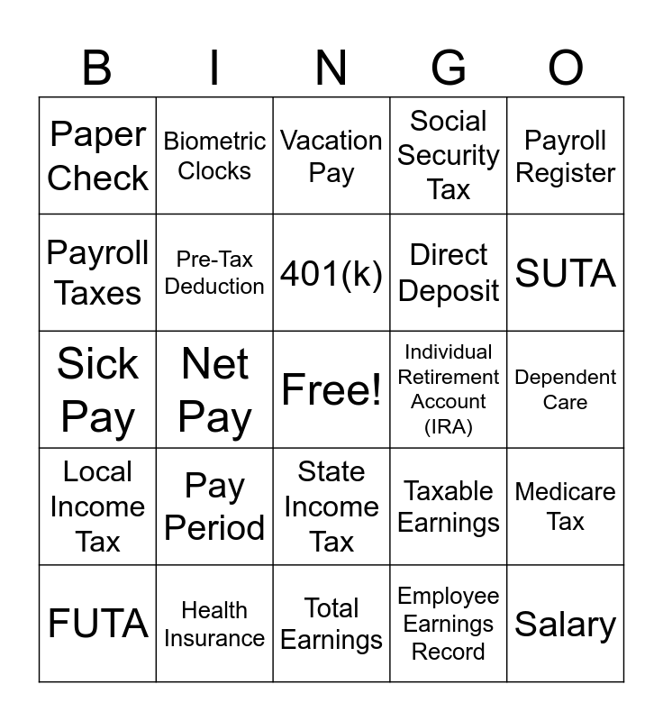 This bingo card has a free space and 48 words: Wages, Salary, Commission, Total Earnings, Pay Period, Time Cards, Biometric Clocks, Proximity clocks, Payroll Taxes, Withholding Allowance, Pre-Tax Deduction, Social Security Tax, Medicare Tax, Taxable Earnings, COBRA, Qualified Retirement Plan, 401(k), Individual Retirement Account (IRA), Roth Individual retirement account (Roth IRA), Payroll Register, Net Pay, Employee Earnings Record, Paper Check, Direct Deposit, Federal Income Tax, SUTA, FUTA, IRS, State Income Tax, Local Income Tax, 401K Match, GTL, Catch Ups, Loans, Health Insurance, Dental Insurance, Vision Insurance, Dependent Care, Flexible Spending, Overtime, Retro Pay, Holiday Pay, Vacation Pay, PTO, Sick Pay, Severance, Workers Comp and FMLA.