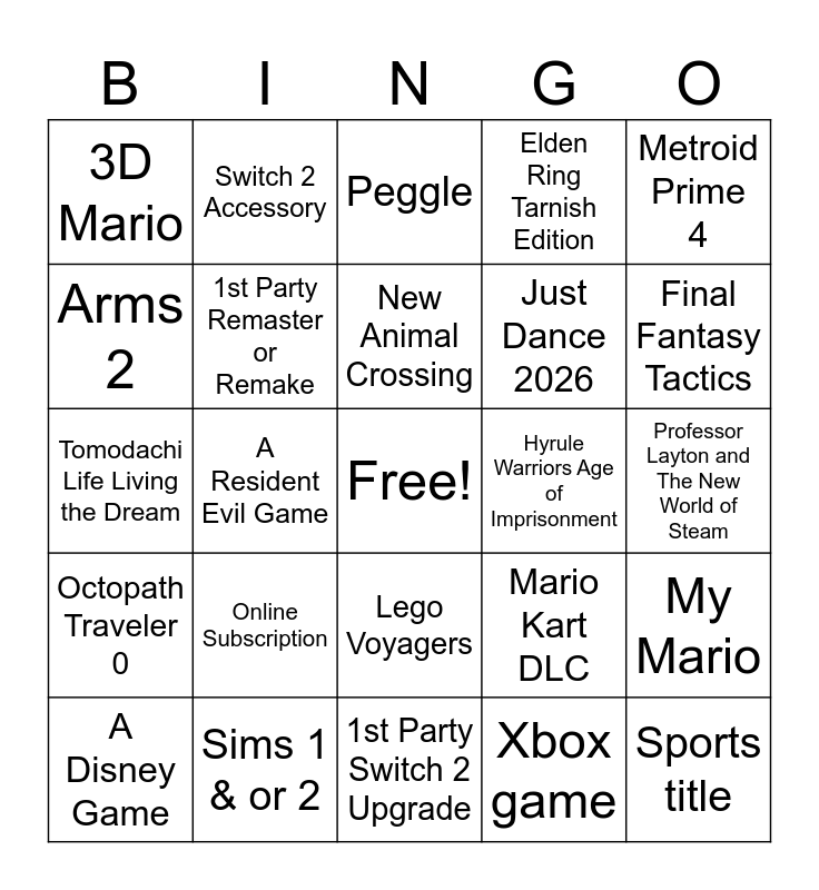 This bingo card has a free space and 24 words: A Disney Game, Online Subscription, New Animal Crossing, Xbox game, Metroid Prime 4, 3D Mario, Switch 2 Accessory, Peggle, Hyrule Warriors Age of Imprisonment, Professor Layton and The New World of Steam, Tomodachi Life Living the Dream, 1st Party Remaster or Remake, Mario Kart DLC, My Mario, Arms 2, Sims 1 & or 2, 1st Party Switch 2 Upgrade, Elden Ring Tarnish Edition, Final Fantasy Tactics, Octopath Traveler 0, A Resident Evil Game, Lego Voyagers, Just Dance 2026 and Sports title.
