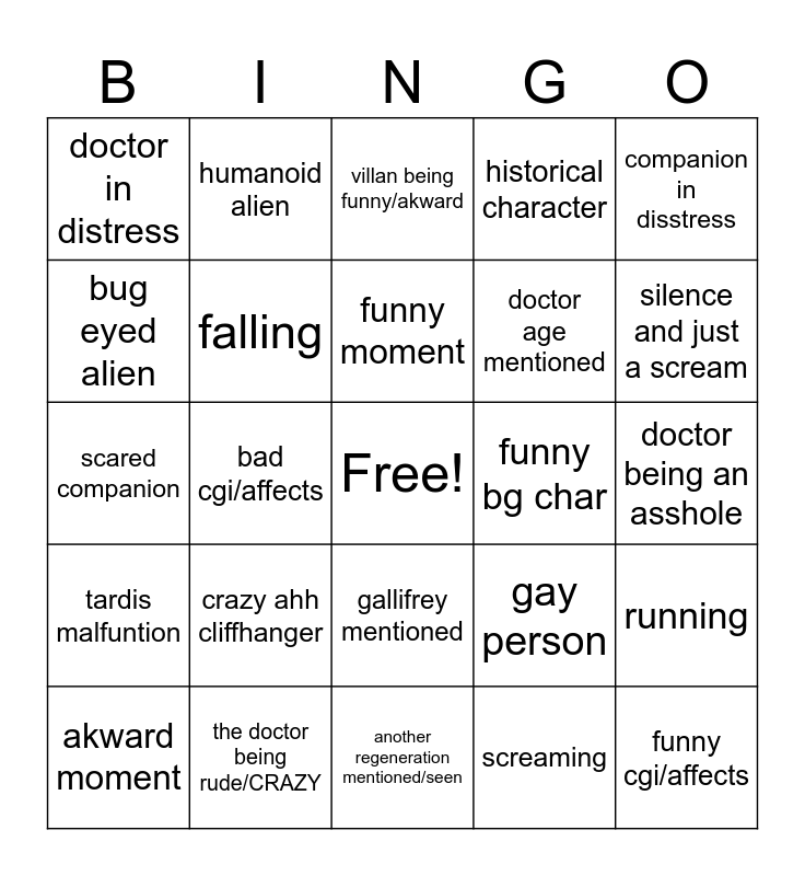 This bingo card has a free space and 24 words: crazy ahh cliffhanger, the doctor being rude/CRAZY, funny moment, akward moment, companion in disstress, doctor in distress, bug eyed alien, humanoid alien, funny bg char, gallifrey mentioned, doctor age mentioned, scared companion, gay person, running, falling, screaming, doctor being an asshole, villan being funny/akward, silence and just a scream, bad cgi/affects, funny cgi/affects, tardis malfuntion, historical character and another regeneration mentioned/seen.