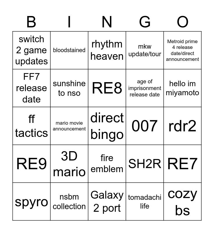 This bingo card has a free space and 24 words: 3D mario, nsbm collection, RE8, spyro, Metroid prime 4 release date/direct announcement, switch 2 game updates, FF7 release date, bloodstained, 007, fire emblem, age of imprisonment release date, ff tactics, SH2R, RE7, sunshine to nso, tomadachi life, rdr2, rhythm heaven, hello im miyamoto, mario movie announcement, cozy bs, RE9, mkw update/tour and Galaxy 2 port.