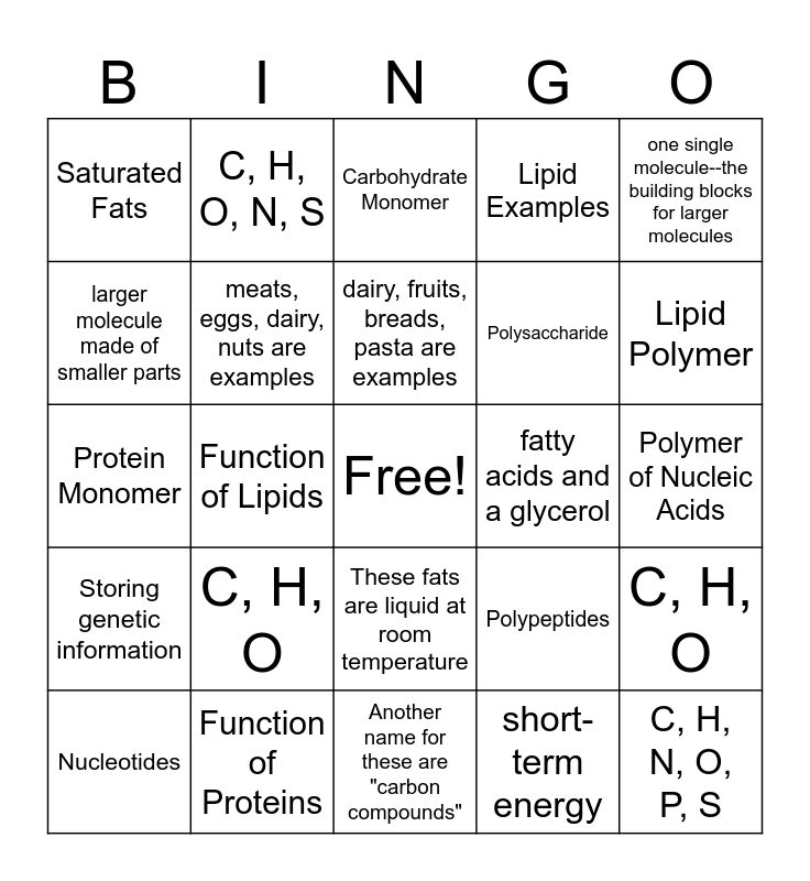 This bingo card has a free space and 24 words: C, H, O, Function of Proteins, dairy, fruits, breads, pasta are examples, Nucleotides, one single molecule--the building blocks for larger molecules, Saturated Fats, larger molecule made of smaller parts, C, H, O, N, S, fatty acids and a glycerol, These fats are liquid at room temperature, Polysaccharide, Protein Monomer, Polypeptides, C, H, O, meats, eggs, dairy, nuts are examples, short-term energy, Polymer of Nucleic Acids, Carbohydrate Monomer, Lipid Polymer, Function of Lipids, C, H, N, O, P, S, Storing genetic information, Lipid Examples and Another name for these are "carbon compounds".
