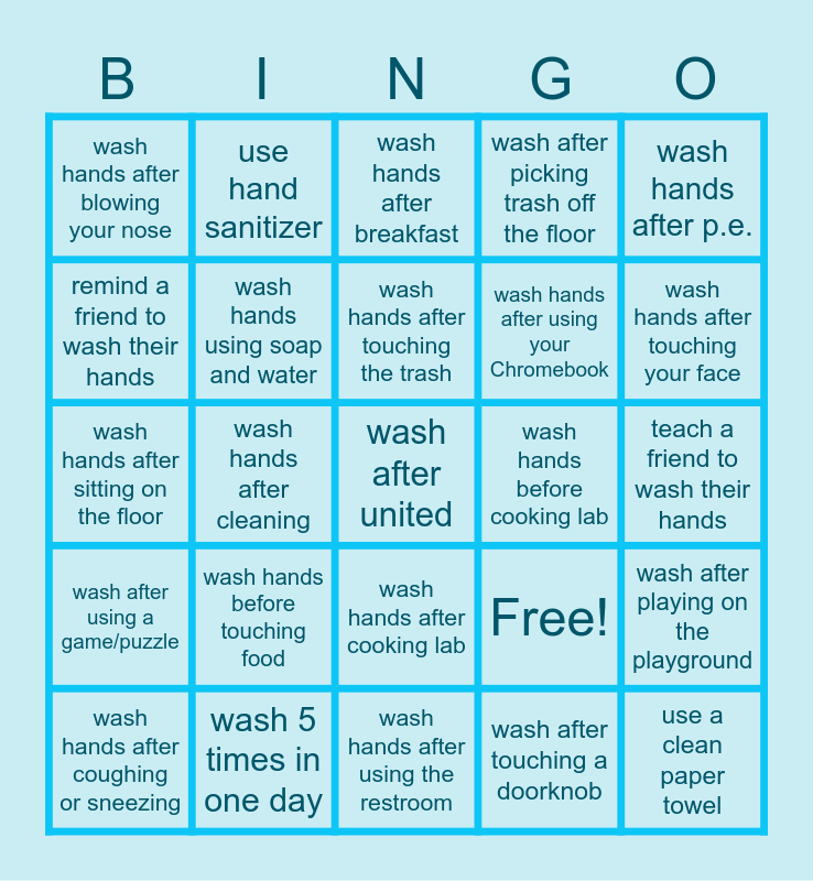 This bingo card has 25 words: wash hands before touching food, wash hands after using the restroom, wash hands after touching the trash, wash hands after coughing or sneezing, wash hands after p.e., wash hands after blowing your nose, remind a friend to wash their hands, use hand sanitizer, wash hands before cooking lab, wash hands after cooking lab, wash hands after using your Chromebook, wash hands after sitting on the floor, Free!, wash after playing on the playground, wash hands using soap and water, use a clean paper towel, teach a friend to wash their hands, wash hands after breakfast, wash hands after touching your face, wash hands after cleaning, wash after united, wash 5 times in one day, wash after using a game/puzzle, wash after picking trash off the floor and wash after touching a doorknob.