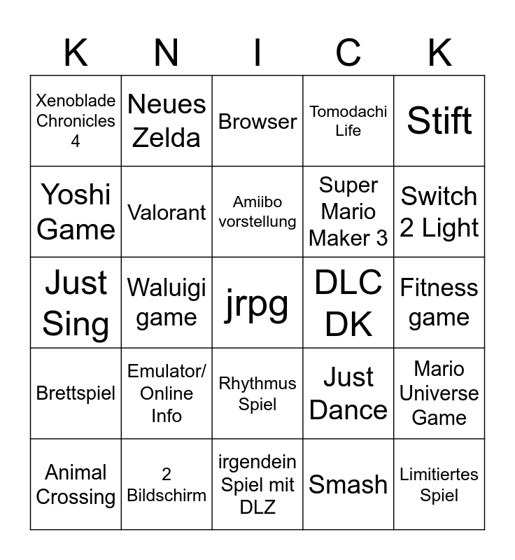 This bingo card has a free space and 24 words: Emulator/ Online Info, 2 Bildschirm, Amiibo vorstellung, Animal Crossing, Stift, Xenoblade Chronicles 4, Yoshi Game, Neues Zelda, DLC DK, Rhythmus Spiel, Super Mario Maker 3, Just Sing, Just Dance, Mario Universe Game, Valorant, Smash, Fitness game, Browser, Switch 2 Light, Waluigi game, Limitiertes Spiel, Brettspiel, Tomodachi Life and irgendein Spiel mit DLZ.