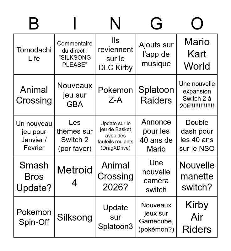 This bingo card has a free space and 24 words: Metroid 4, Silksong, Pokemon Z-A, Pokemon Spin-Off, Mario Kart World, Tomodachi Life, Animal Crossing, Commentaire du direct : "SILKSONG PLEASE", Annonce pour les 40 ans de Mario, Animal Crossing 2026?, Splatoon Raiders, Un nouveau jeu pour Janvier / Fevrier, Une nouvelle caméra switch, Nouvelle manette switch?, Nouveaux jeu sur GBA, Nouveaux jeux sur Gamecube, (pokémon?), Double dash pour les 40 ans sur le NSO, Ils reviennent sur le DLC Kirby, Une nouvelle expansion Switch 2 à 20€!!!!!!!!!!!!!!, Les thèmes sur Switch 2 (por favor), Kirby Air Riders, Smash Bros Update?, Ajouts sur l'app de musique and Update sur Splatoon3.