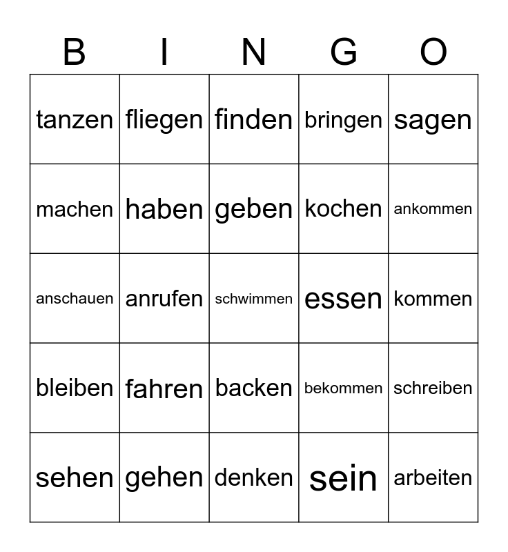 This bingo card has a free space and 24 words: fahren, gehen, geben, sehen, sagen, tanzen, machen, fliegen, essen, backen, kochen, anschauen, bekommen, schreiben, haben, sein, kommen, finden, ankommen, anrufen, arbeiten, bleiben, bringen and denken.