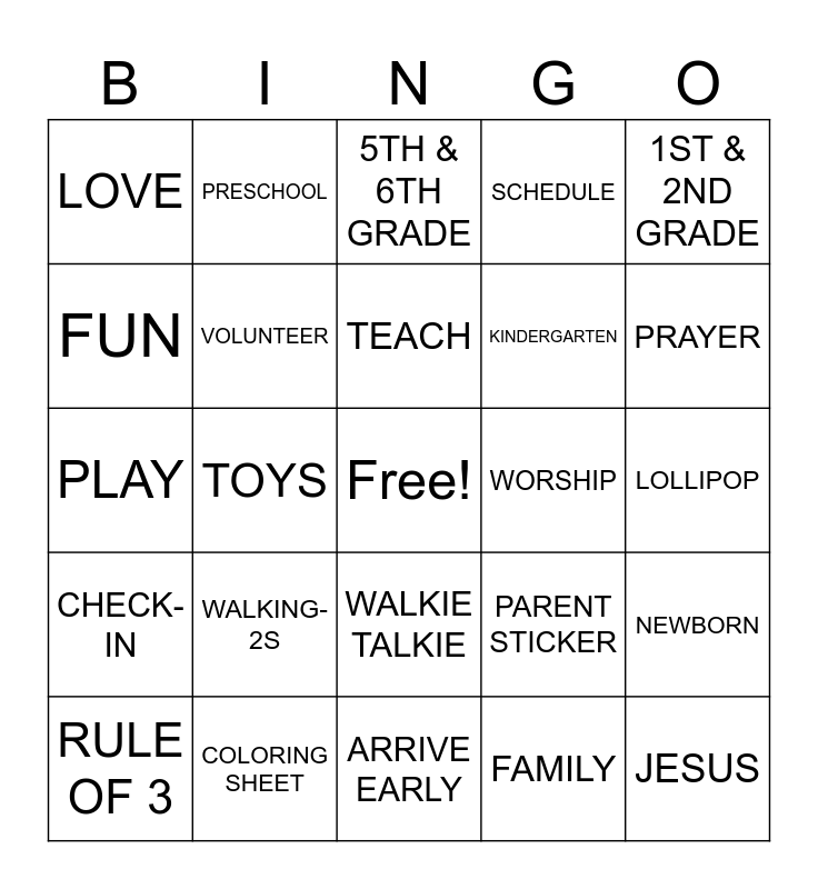 This bingo card has a free space and 32 words: FAMILY, 3RD & 4TH GRADE, TOYS, HORSESHOE, CHECK-IN, VOLUNTEER, 1ST & 2ND GRADE, NEWBORN, PRESCHOOL, RISE TEAM, TEACH, 5TH & 6TH GRADE, SAFE, FOOSBALL, WORSHIP, AIR HOCKEY, RULE OF 3, PLAY, WALKIE TALKIE, WALKING-2S, PARENT STICKER, FIRST AID, LOLLIPOP, COLORING SHEET, JESUS, SCHEDULE, KINDERGARTEN, FUN, LOVE, ARRIVE EARLY, FRIENDS and PRAYER.