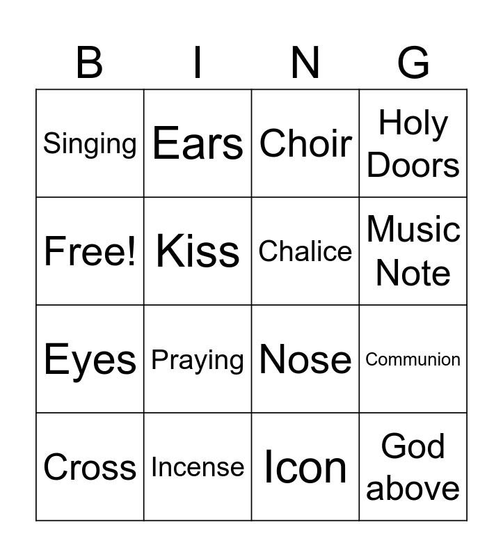 This bingo card has 16 words: Incense, Communion, Choir, Singing, Eyes, Ears, Nose, Icon, Free!, Kiss, Cross, Holy Doors, Praying, Music Note, Chalice and God above.