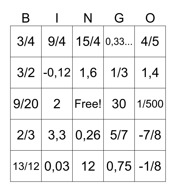This bingo card has a free space and 26 words: 0,26, 0,75, 1,6, 0,03, 4/5, 3/4, 3/2, 9/4, 1/500, 5/7, 1/3, 9/20, -7/8, 13/12, 2, 2,75, 0,33..., 2/3, 15/4, -1/8, 1,4, 12, 30, 3,3, -0,12 and -18/25.