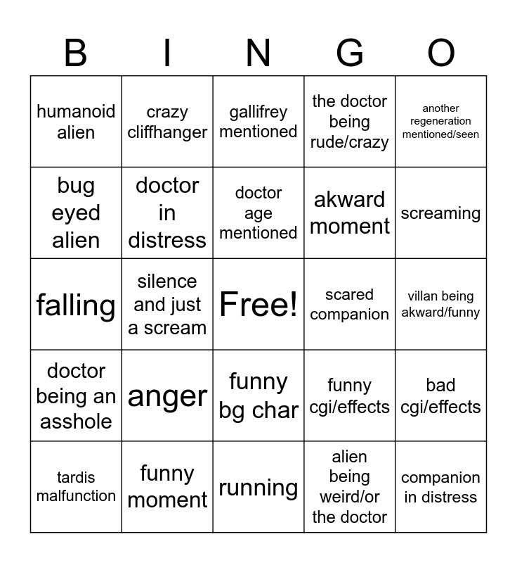 This bingo card has a free space and 24 words: anger, funny moment, doctor age mentioned, tardis malfunction, another regeneration mentioned/seen, humanoid alien, bug eyed alien, crazy cliffhanger, scared companion, funny bg char, akward moment, falling, funny cgi/effects, bad cgi/effects, doctor in distress, alien being weird/or the doctor, villan being akward/funny, gallifrey mentioned, screaming, silence and just a scream, companion in distress, doctor being an asshole, the doctor being rude/crazy and running.