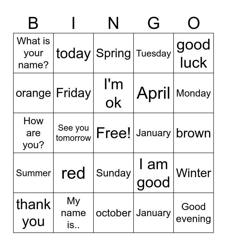 This bingo card has a free space and 25 words: red, october, I'm ok, thank you, good luck, What is your name?, orange, today, January, Sunday, April, How are you?, I am good, Winter, Friday, purple, brown, Spring, Monday, See you tomorrow, Good evening, My name is.., Summer, Tuesday and January.