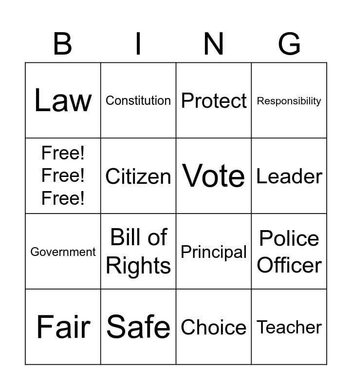This bingo card has 16 words: Safe, Police Officer, Protect, Law, Government, Constitution, Principal, Choice, Free! Free! Free!, Citizen, Fair, Responsibility, Bill of Rights, Leader, Vote and Teacher.
