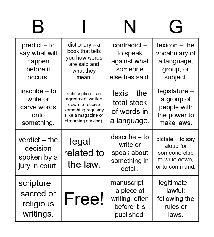 This bingo card has 16 words: Free!, dictate – to say aloud for someone else to write down, or to command., contradict – to speak against what someone else has said., predict – to say what will happen before it occurs., verdict – the decision spoken by a jury in court., dictionary – a book that tells you how words are said and what they mean., describe – to write or speak about something in detail., manuscript – a piece of writing, often before it is published., inscribe – to write or carve words onto something., subscription – an agreement written down to receive something regularly (like a magazine or streaming service)., scripture – sacred or religious writings., lexicon – the vocabulary of a language, group, or subject., legal – related to the law., legislature – a group of people with the power to make laws., lexis – the total stock of words in a language. and legitimate – lawful; following the rules or laws..