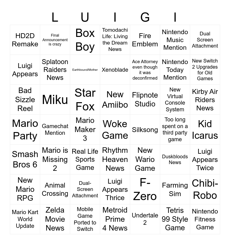 This bingo card has a free space and 48 words: F-Zero, Nintendo Today Mention, Metroid Prime 4 News, Gamechat Mention, Star Fox, Kid Icarus, Final Announcement is crazy, Zelda Movie News, Nintendo Music Mention, Rhythm Heaven News, Dual Screen Attachment, Tomodachi Life: Living the Dream News, New Virtual Console System, Flipnote Studio, New Mario RPG, Too long spent on a third party game, Luigi Appears, New Switch 2 Upgrades for Old Games, Farming Sim, Fire Emblem, Ace Attorney even though it was deconfirmed, Mario Maker 3, HD2D Remake, Splatoon Raiders News, Chibi-Robo, Earthbound/Mother, Kirby Air Riders News, Mario Kart World Update, New Amiibo, Miku, Tetris 99 Style Game, Silksong, Luigi Appears Twice, Animal Crossing, Mario Party, New Wario Game, Duskbloods News, Bad Sizzle Reel, Real Life Sports Game, Dual-Screen Attachment, Smash Bros 6, Nintendo Fitness Game, Box Boy, Mobile Game Ported to Switch, Xenoblade, Luigi Appears Thrice, Mario is Missing 2 and Undertale 2.