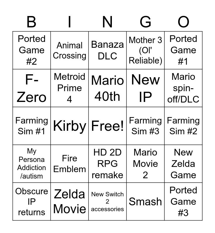 This bingo card has a free space and 24 words: Fire Emblem, Zelda Movie, Mario 40th, Obscure IP returns, Ported Game #1, Ported Game #2, F-Zero, Animal Crossing, Farming Sim #3, HD 2D RPG remake, New IP, Farming Sim #1, Mario Movie 2, New Zelda Game, Metroid Prime 4, Smash, Farming Sim #2, Banaza DLC, Mario spin-off/DLC, Kirby, Ported Game #3, My Persona Addiction /autism, Mother 3 (Ol' Reliable) and New Switch 2 accessories.
