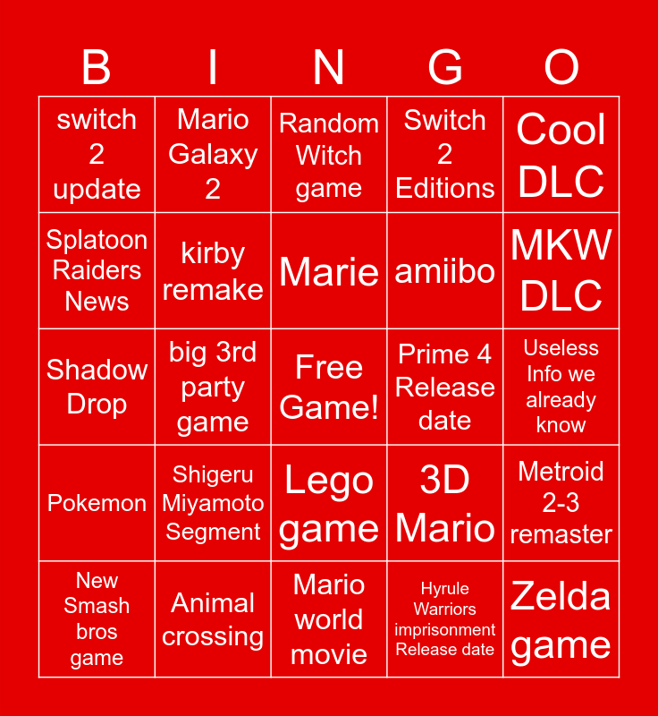 This bingo card has a free space and 24 words: Shigeru Miyamoto Segment, Animal crossing, Marie, New Smash bros game, Cool DLC, switch 2 update, Splatoon Raiders News, Mario Galaxy 2, Prime 4 Release date, Lego game, amiibo, Shadow Drop, 3D Mario, Metroid 2-3 remaster, kirby remake, Hyrule Warriors imprisonment Release date, Useless Info we already know, Random Witch game, MKW DLC, big 3rd party game, Zelda game, Pokemon, Switch 2 Editions and Mario world movie.