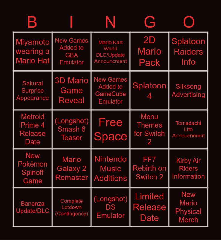 This bingo card has a free space and 24 words: Mario Galaxy 2 Remaster, Complete Letdown (Contingency), New Games Added to GameCube Emulator, Bananza Update/DLC, Splatoon Raiders Info, Miyamoto wearing a Mario Hat, Sakurai Surprise Appearance, New Games Added to GBA Emulator, Menu Themes for Switch 2, Nintendo Music Additions, Splatoon 4, Metroid Prime 4 Release Date, FF7 Rebirth on Switch 2, Kirby Air Riders Information, 3D Mario Game Reveal, Limited Release Date, Tomadachi Life Annoucnment, Mario Kart World DLC/Update Announcment, Silksong Advertising, (Longshot) Smash 6 Teaser, New Mario Physical Merch, New Pokémon Spinoff Game, 2D Mario Pack and (Longshot) DS Emulator.