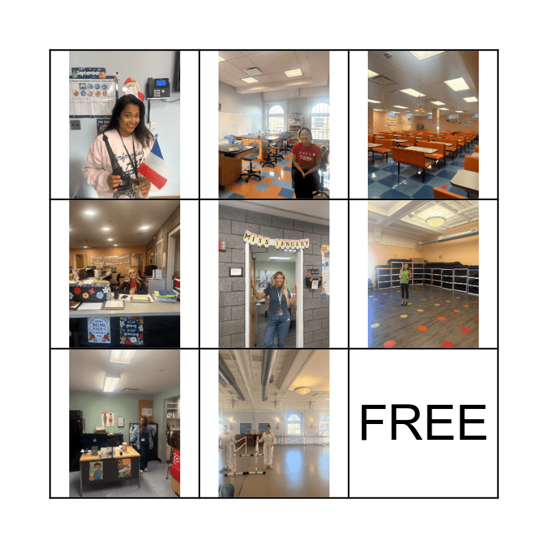 This bingo card has 8 images and 2 words: FREE and FREE.