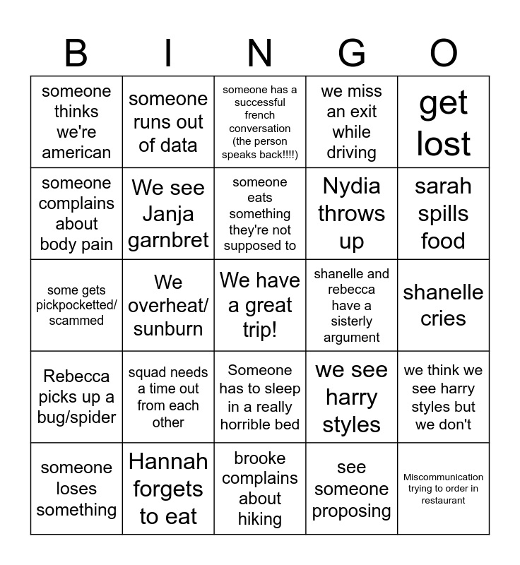This bingo card has a free space and 24 words: someone loses something, squad needs a time out from each other, someone eats something they're not supposed to, see someone proposing, get lost, someone thinks we're american, someone runs out of data, someone has a successful french conversation (the person speaks back!!!!), shanelle and rebecca have a sisterly argument, shanelle cries, some gets pickpocketted/ scammed, We see Janja garnbret, we see harry styles, we think we see harry styles but we don't, someone complains about body pain, Hannah forgets to eat, brooke complains about hiking, we miss an exit while driving, sarah spills food, Rebecca picks up a bug/spider, We overheat/ sunburn, Someone has to sleep in a really horrible bed, Nydia throws up and Miscommunication trying to order in restaurant.